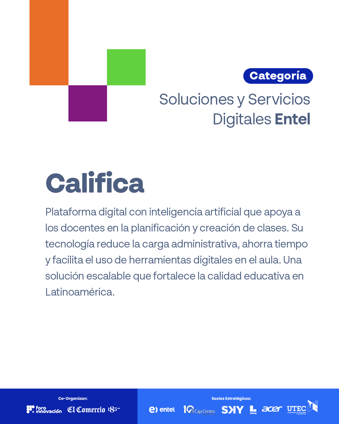 Califica es una plataforma digital con inteligencia artificial que apoya a los docentes en la planificación y creación de clases. Su tecnología reduce la carga administrativa, ahorra tiempo y facilita el uso de herramientas digitales en el aula. Una solución escalable que fortalece la calidad educativa en Latinoamérica.