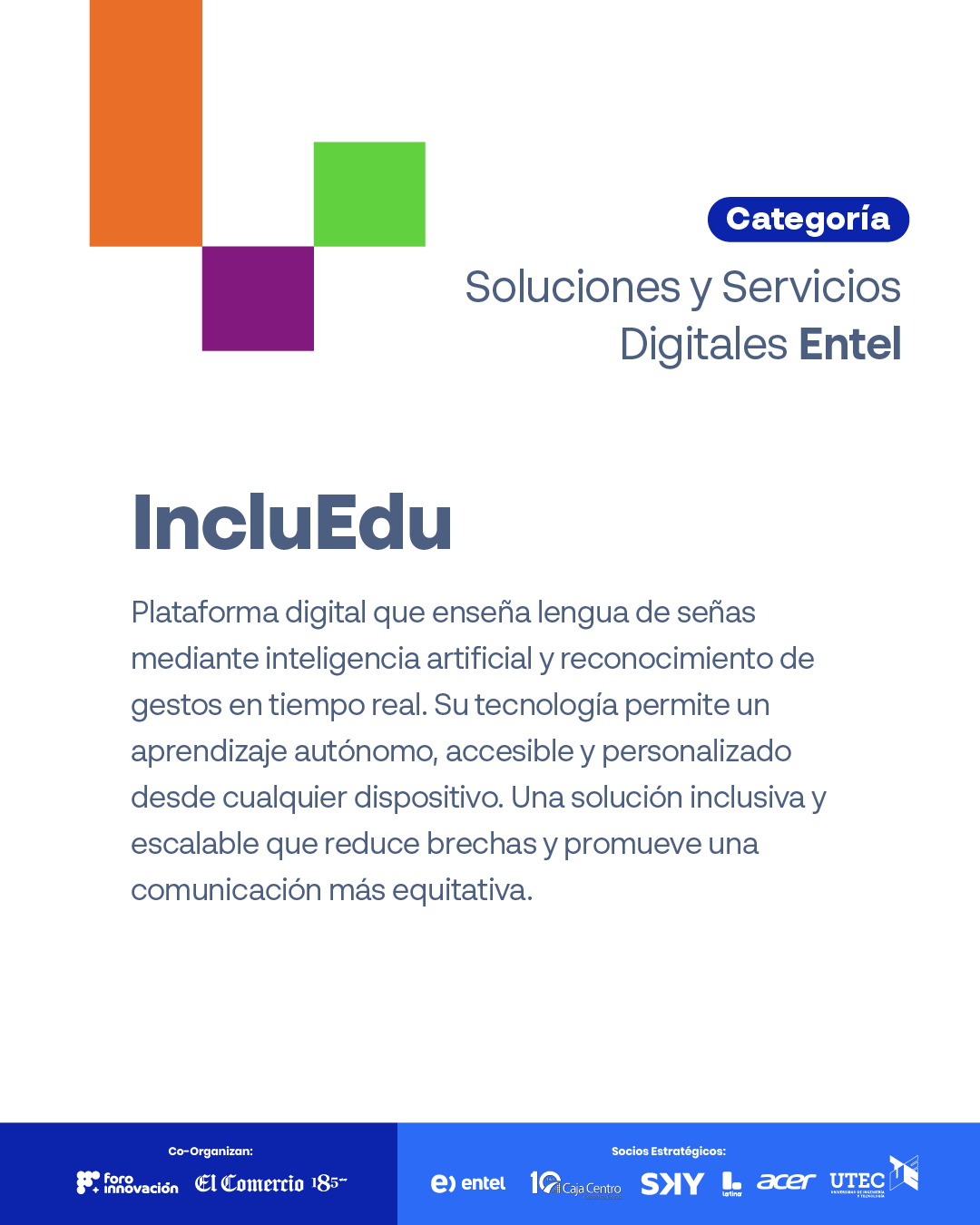 IncluEdu es una plataforma digital que enseña lengua de señas mediante inteligencia artificial y reconocimiento de gestos en tiempo real. Su tecnología permite un aprendizaje autónomo, accesible y personalizado desde cualquier dispositivo. Una solución inclusiva y escalable que reduce brechas y promueve una comunicación más equitativa.