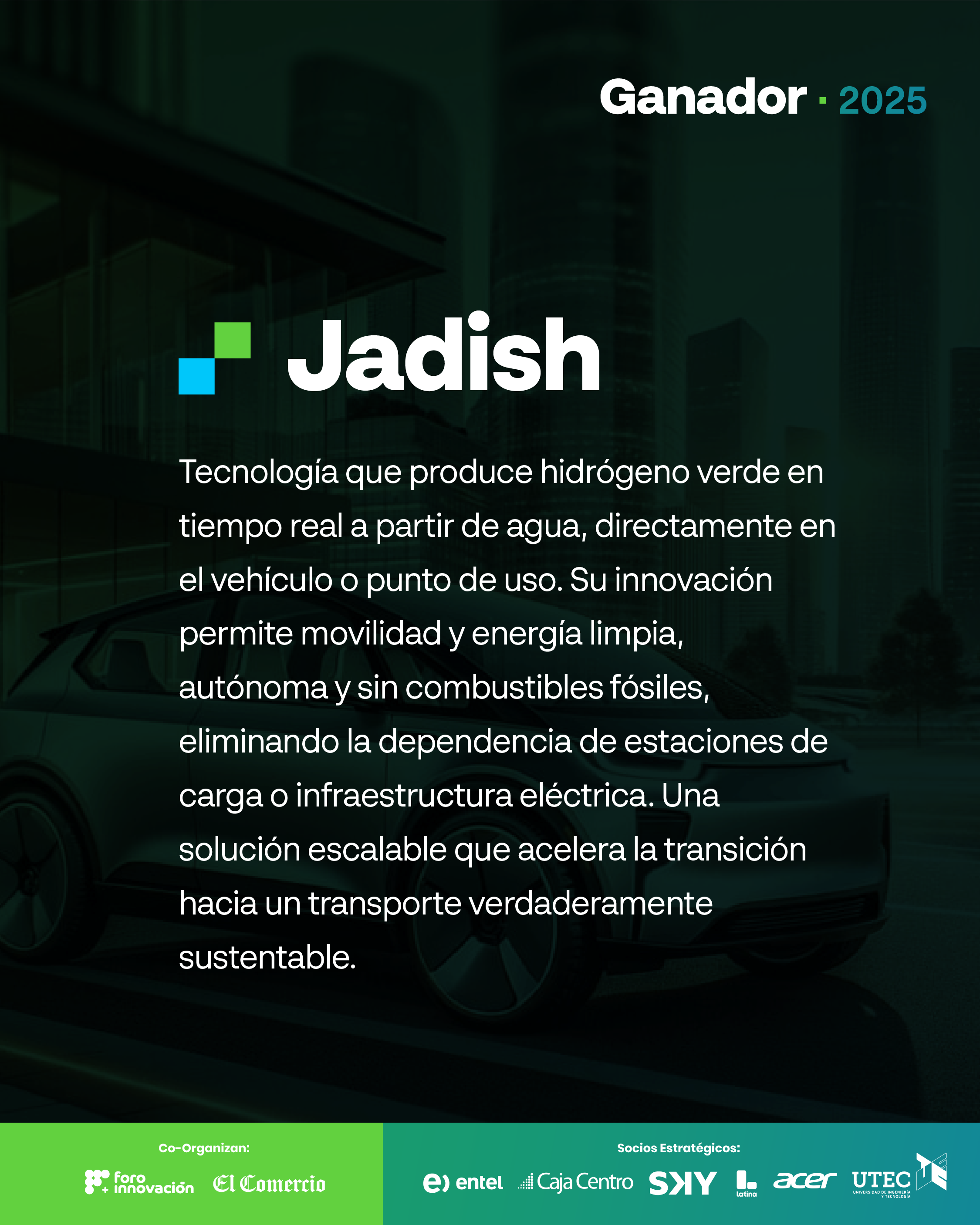 Jadish es una tecnología que produce hidrógeno verde en tiempo real a partir de agua, directamente en el vehículo o punto de uso. Su innovación permite movilidad y energía limpia, autónoma y sin combustibles fósiles, eliminando la dependencia de estaciones de carga o infraestructura eléctrica. Una solución escalable que acelera la transición hacia un transporte verdaderamente sustentable.
